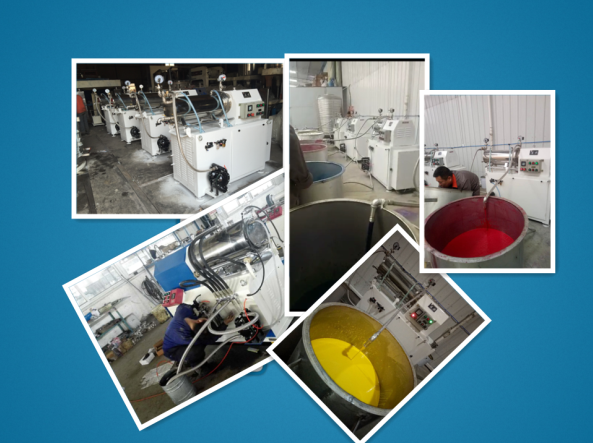 臥式密閉砂磨機是一種采用濕法研磨分散、筒體水平安裝、連續密閉生產的化工設備;型氣動雙隔膜泵(或齒輪泵)將經過預分散、潤濕處理的固液相混合物料輸入筒體內,物料和筒體內的研磨介質一起被高速旋轉的分散器組所攪動,使物料中的固體顆粒和研磨介質間產生強烈的碰撞、剪切,在短時間內達到物料顆粒的磨細和分散聚集體的目的。研磨分散物料效果是生產油漆、油墨、染料等產品的設備